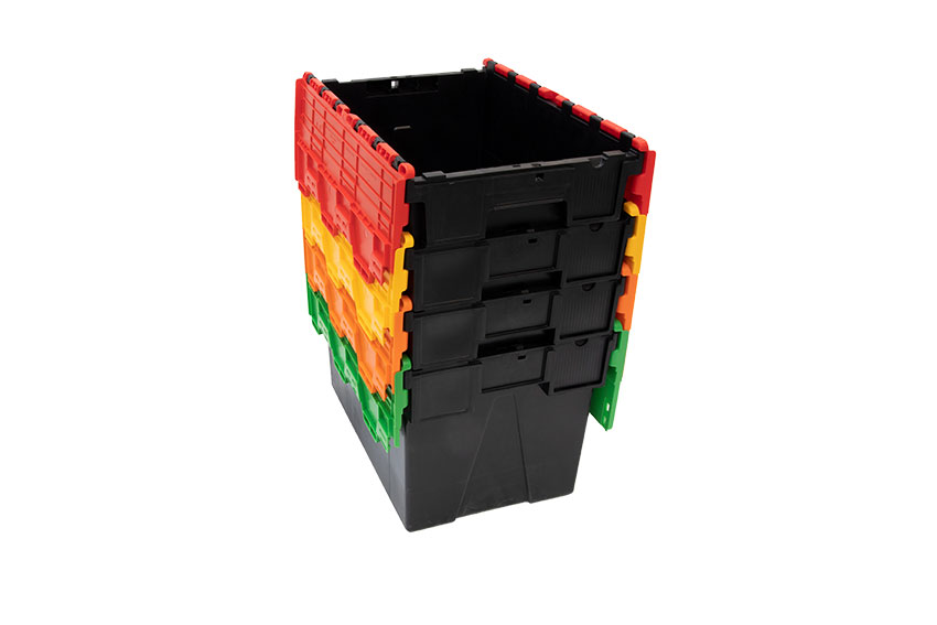 - Einzigartiges Deckeldesign: lässt sich beim Stapeln vollständig flach neben den Behälter klappen, wodurch Beschädigungen am Behälter reduziert werden und zusätzlicher Platz beim Rücktransport gespart wird