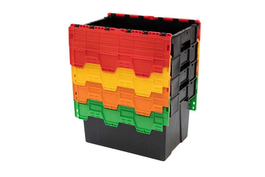 - Einzigartiges Deckeldesign: lässt sich beim Stapeln vollständig flach neben den Behälter klappen, wodurch Beschädigungen am Behälter reduziert werden und zusätzlicher Platz beim Rücktransport gespart wird