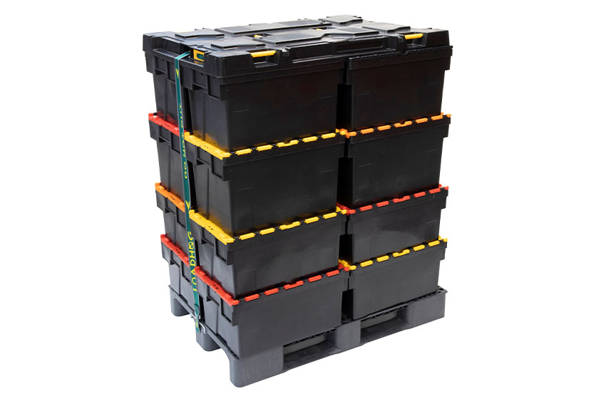 - Unique lid design: folds completely flat next to the container when nested, reducing damage to the container and saving extra space during return transport