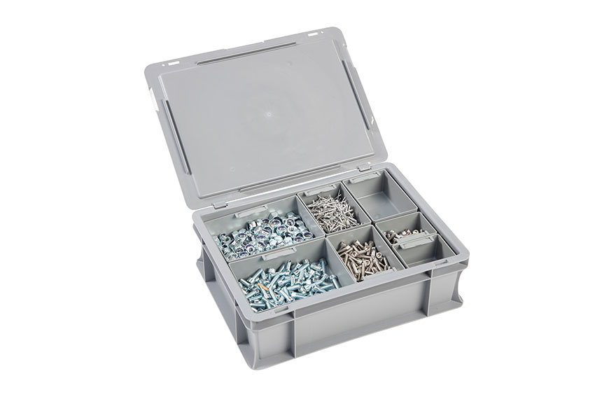 • Euronorm case with hinged lid, 2 sealing clips and ergonomic handle