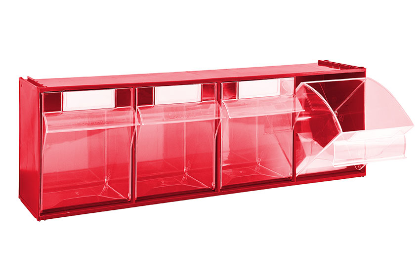 - Kantelbakjes voor een overzichtelijke stockage en stofvrije presentatie vanijzerwaren, kleine componenten en onderdelen